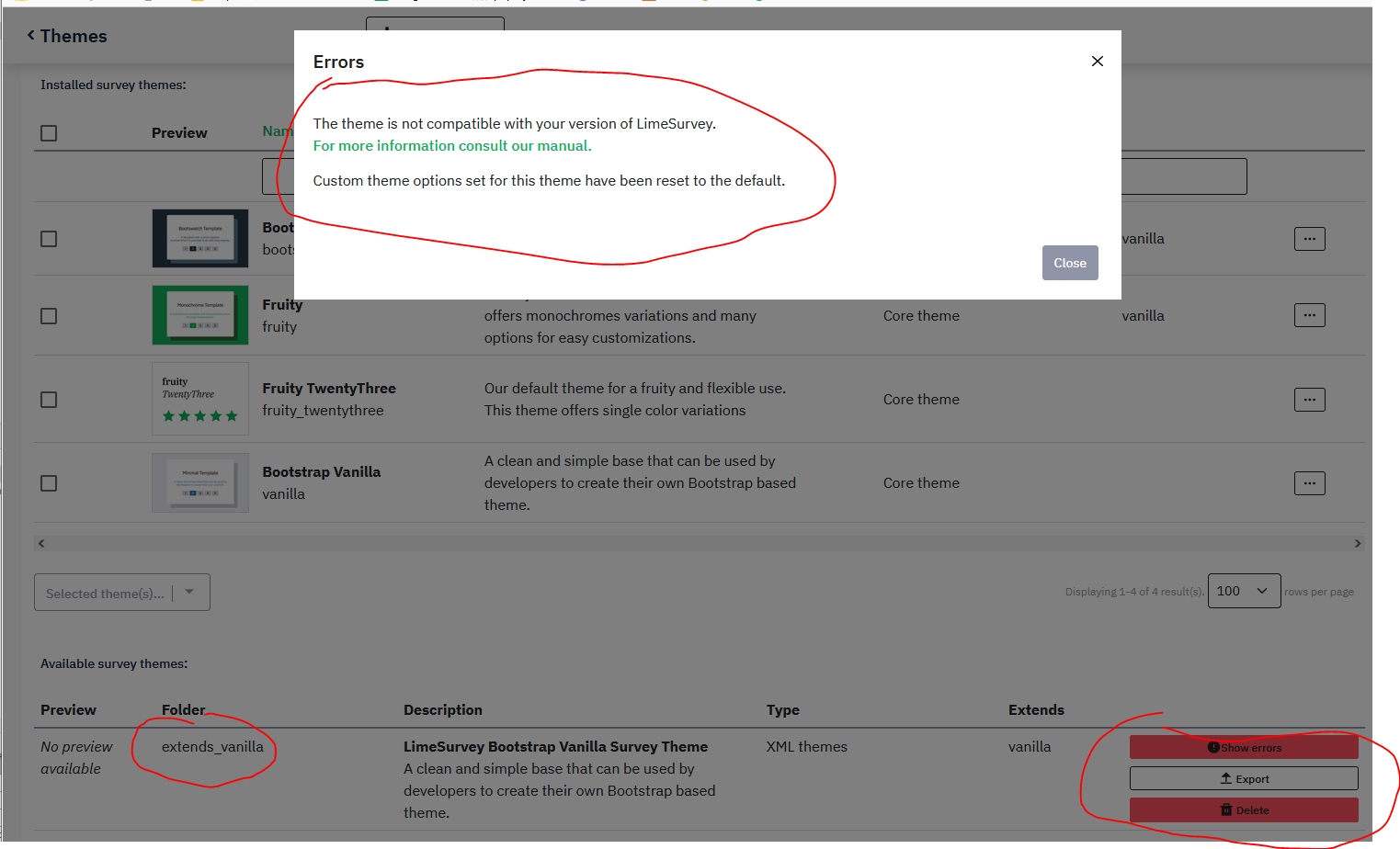 Hi @tibor.pacalat, There is a bug with extending the base survey theme that is included in the latest version. Here's how to re-create the issue: 1) Under Themes extend the Fruity TwentyThree theme. |