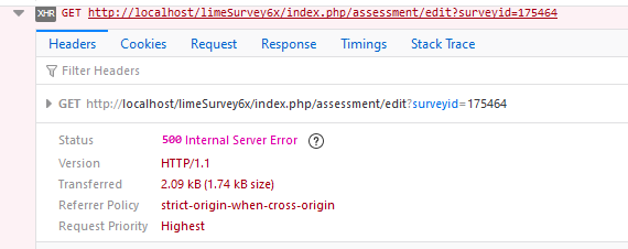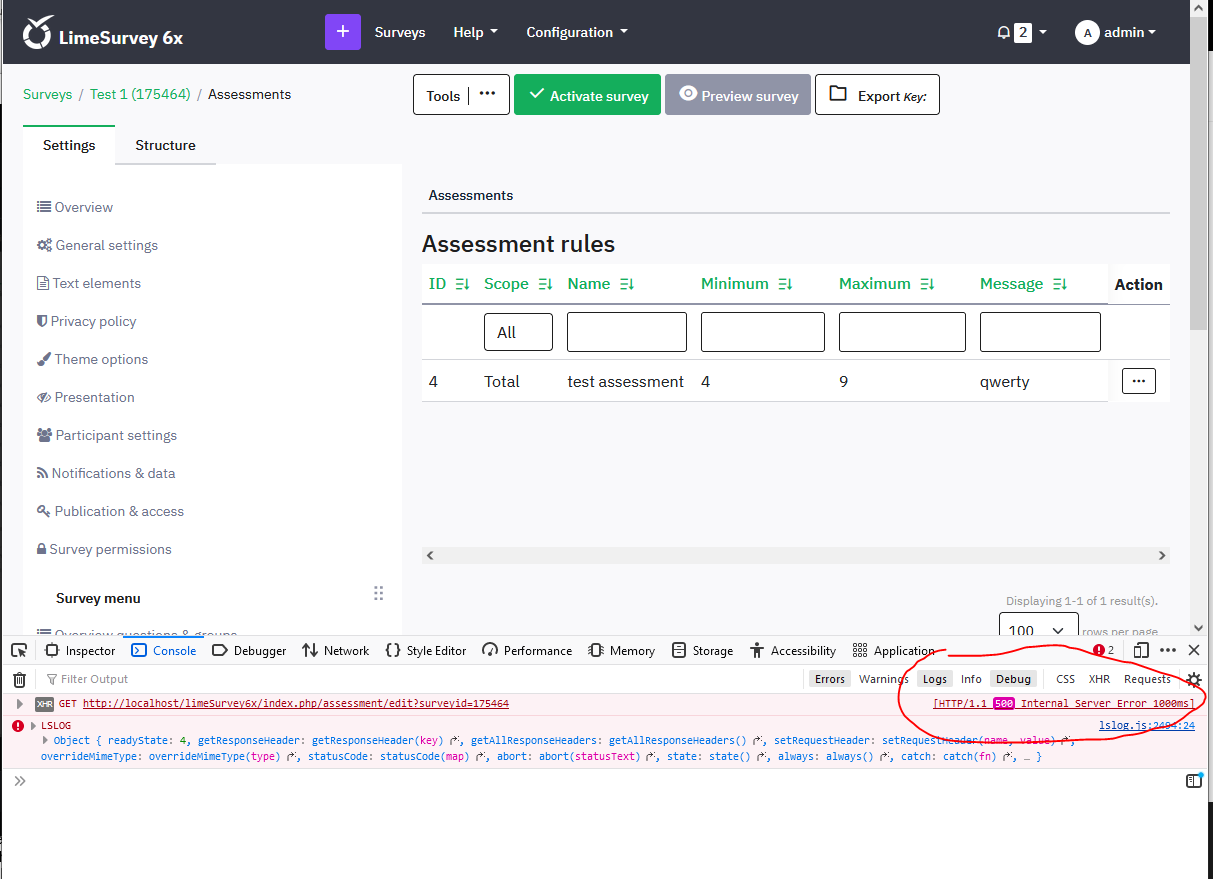 | Description | After updating to 6.2.0, I can not edit assessments. Clicking the "edit" button results in a server error - screenshot attached. Clicking the "Delete" button results in a message "Could not delete assessment rule". Screencast - https://screenpal.com/watch/c0jeXPVkkzI Sample survey attached. | ||||