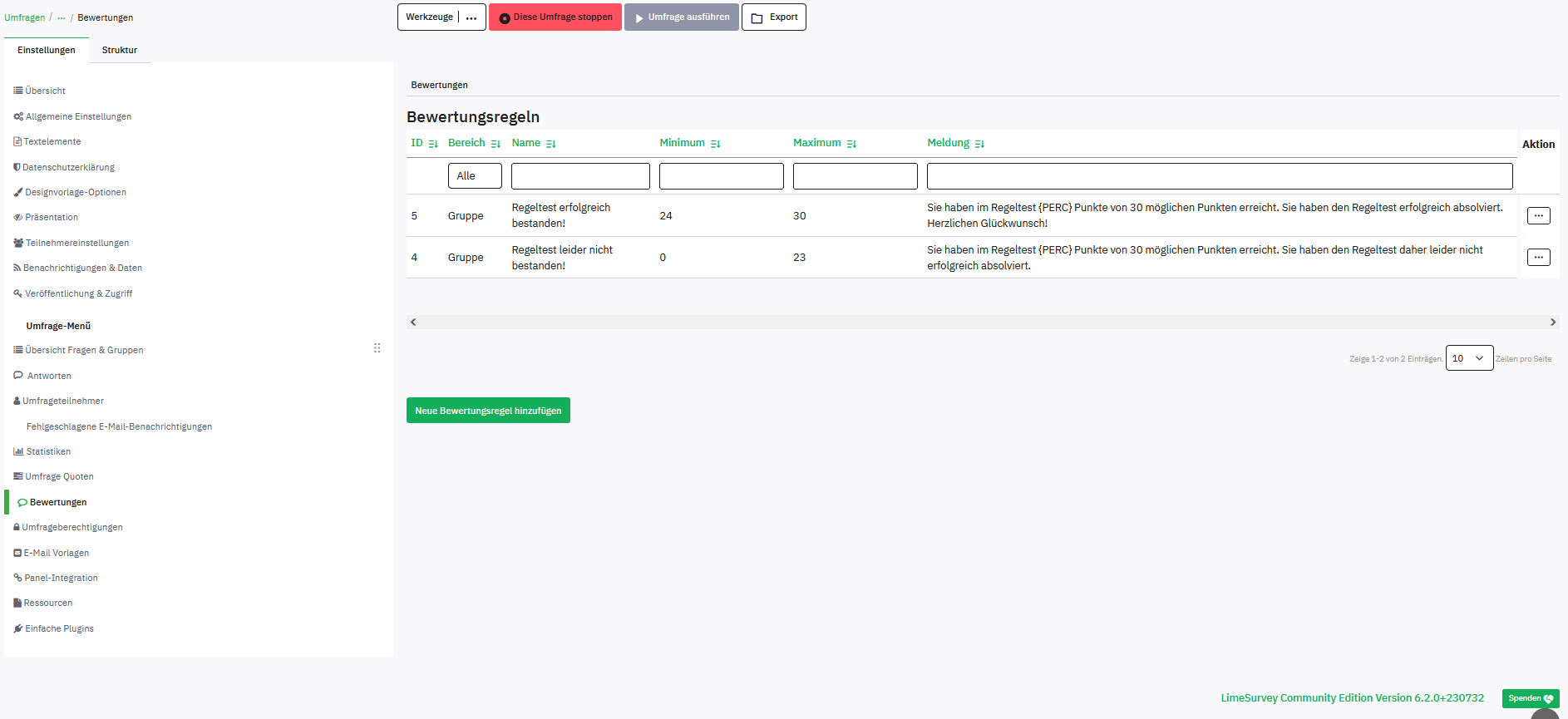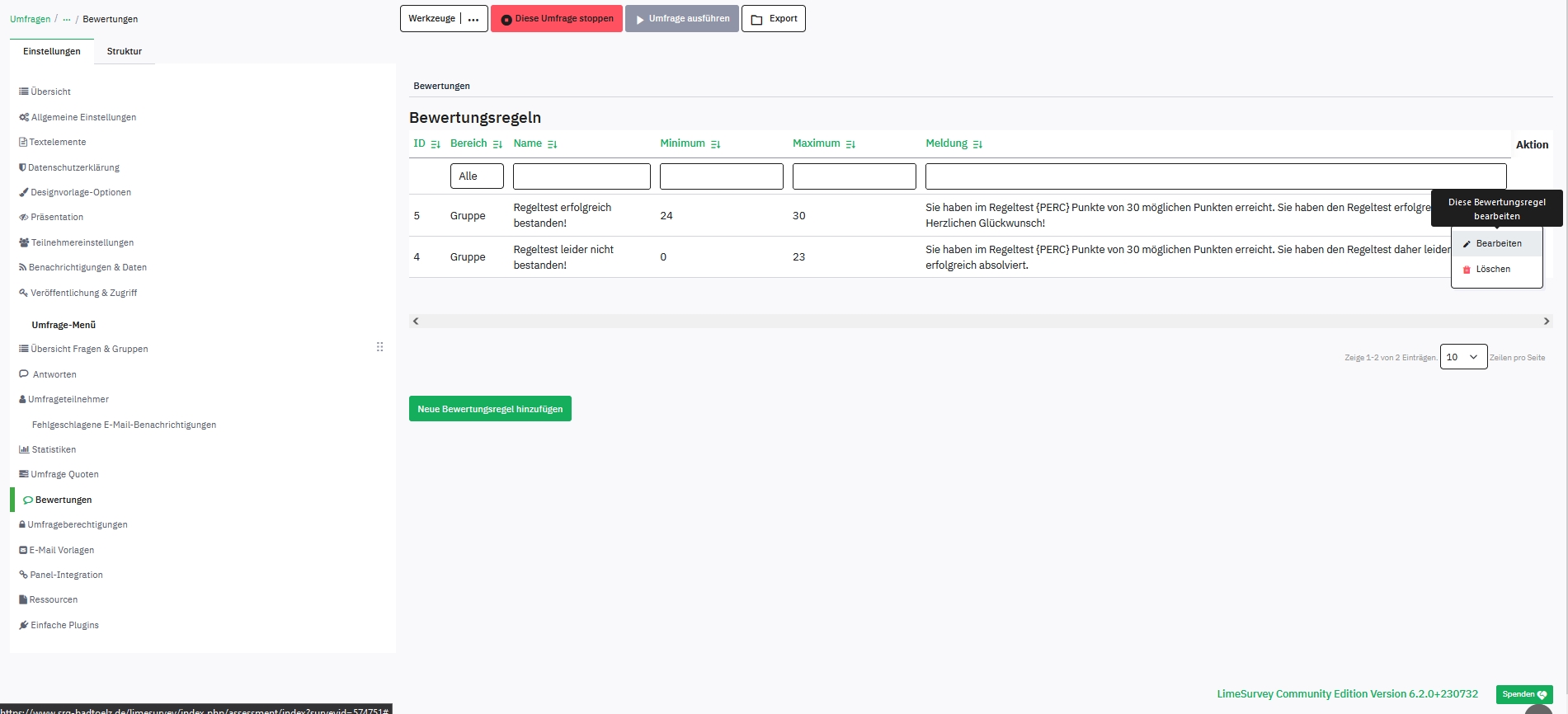 Expected resultI expect to get an opened editor-window with shown content of the selected rule (as running in Limesurvey V 5.x.x) and the possibilty to edit this content. Actual resultI get at the moment an opened editor-window with empty content and the header and close-Button to "add"/"hinzufügen" a new assessment rule. | ||||