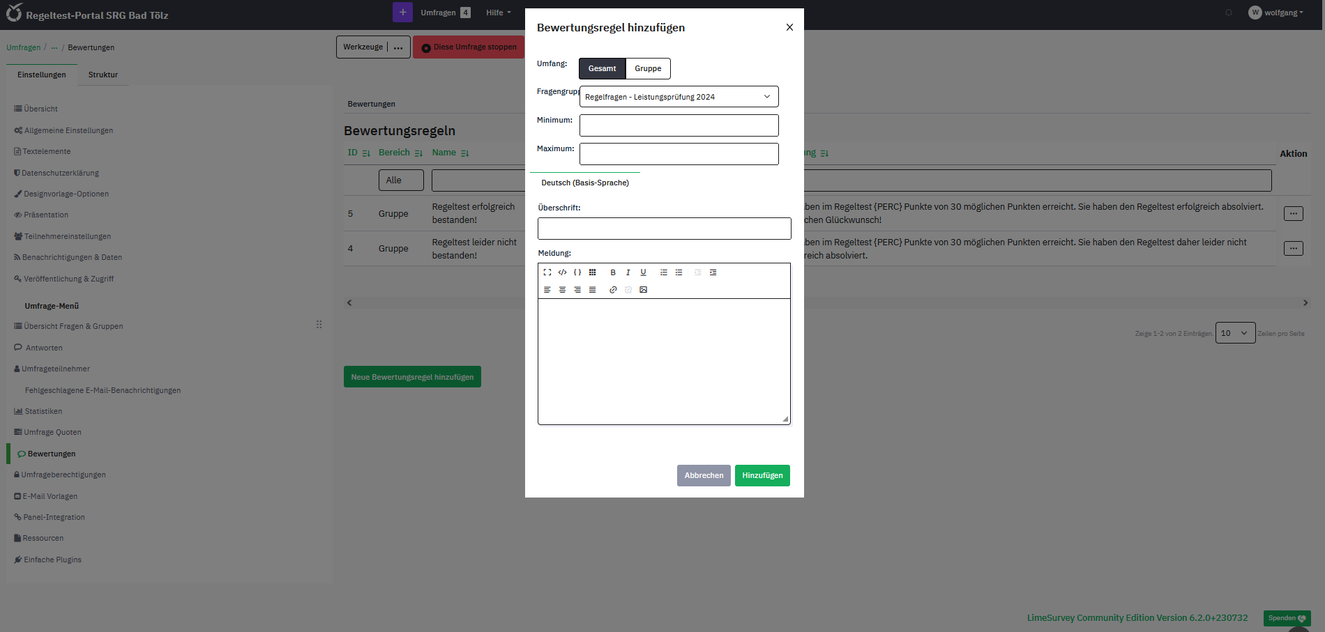 Expected resultI expect to get an opened editor-window with shown content of the selected rule (as running in Limesurvey V 5.x.x) and the possibilty to edit this content. Actual resultI get at the moment an opened editor-window with empty content and the header and close-Button to "add"/"hinzufügen" a new assessment rule. | ||||