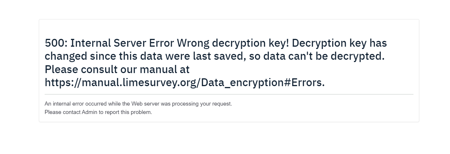| Description | I'm using your Docker image, and whenever I select the "Central participant management" link in the Configuration tab in the header, I experience a problem with an encryption key. When I click on the Central participant management option, I get the following error message: are seeing this "Internal Server Error Wrong decryption key" error again in our service. Do we need to go to a backup to get it fixed? How can we confirm that the values in the environment are being properly set for encryption and decryption? We see this issue when clicking on this link (after authenticating) 500: Internal Server Error Wrong decryption key! Decryption key has changed since this data were last saved, so data can't be decrypted. Please consult our manual at https://manual.limesurvey.org/Data_encryption#Errors. END I've been passing the encryption key in the environment variable since the creation of the instance, but I've been having problems with it since last week after upgrading to the latest version. I've checked your previous documentation on the subject and tried everything suggested there, including trying to reset the SMTP password, but the problem still persists. LIME_ENCRYPTION_KEYPAIR=xxxxxxxxxxxxxxxxxxxxxxxxxx Please investigate this matter and assist me in finding a quick solution. Also, please let me know if you need anything more information from my end. Thanks in advance. | ||||