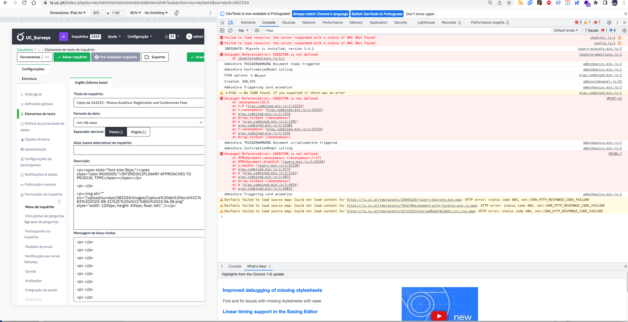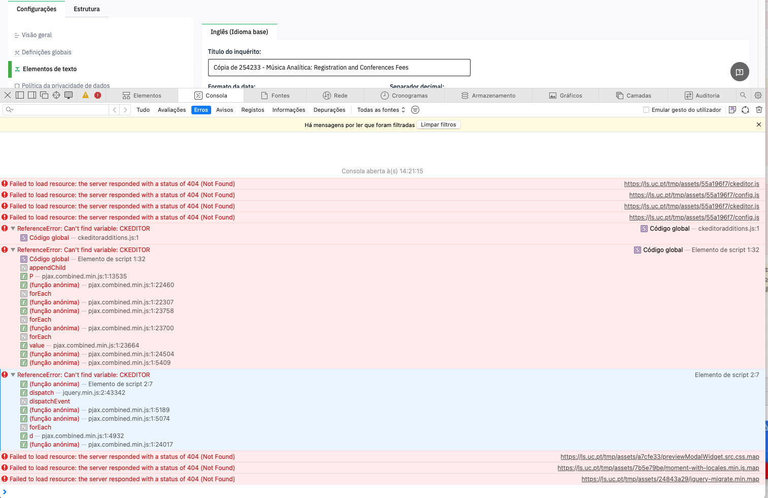 Hi, Some problem once again: HTML editor is not shown I have cleared the LS assets but this time it did not worked. -- João LimeSurvey Community Edition Versão 6.3.2+231031 |