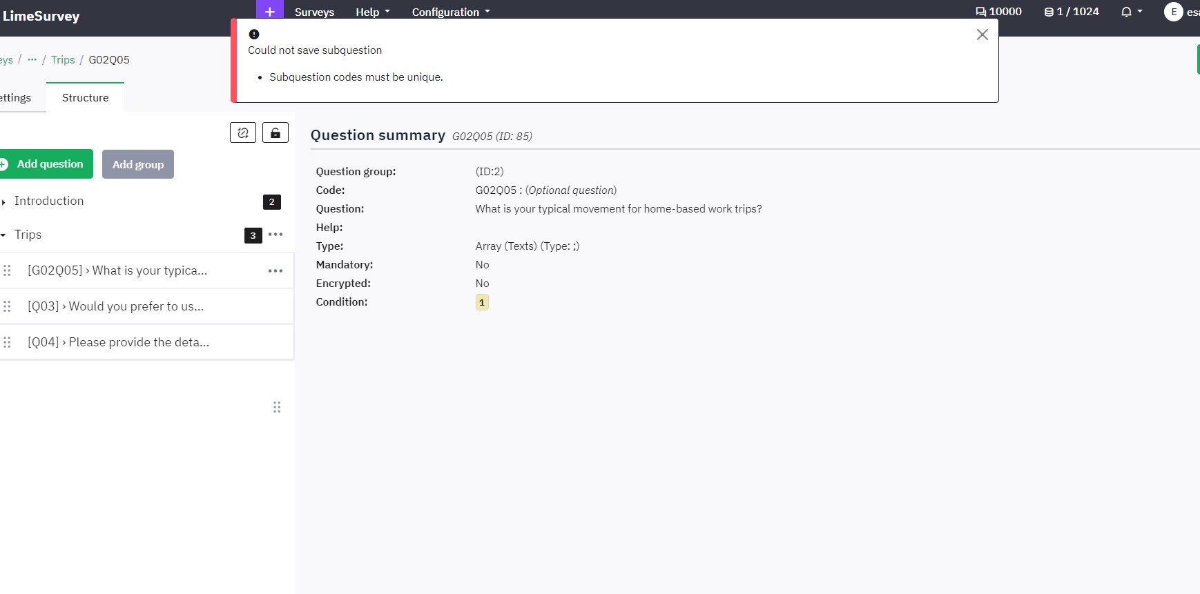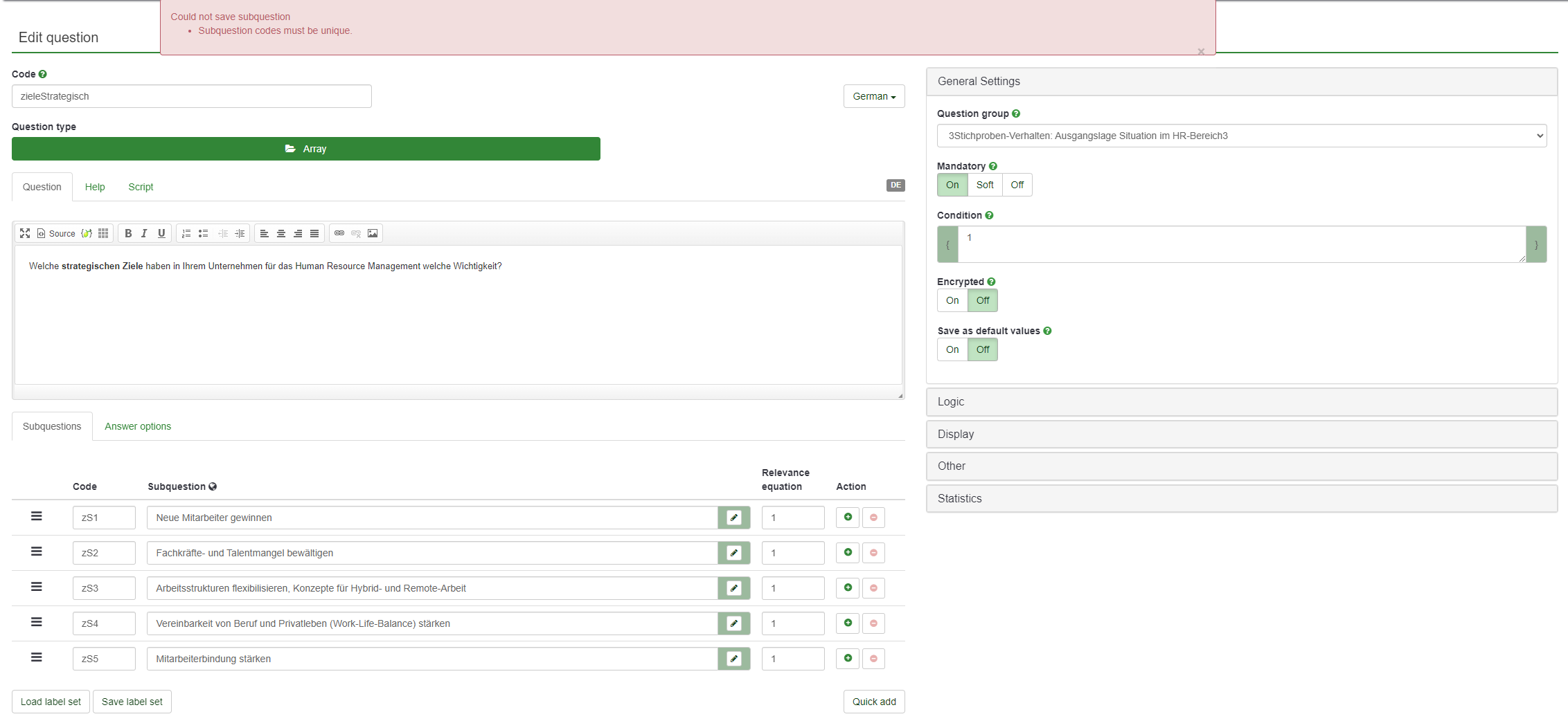 | Summary | 19108: Error: Subquestion codes should be unique. Cannot save the subquestions even their codes are unique. | ||||