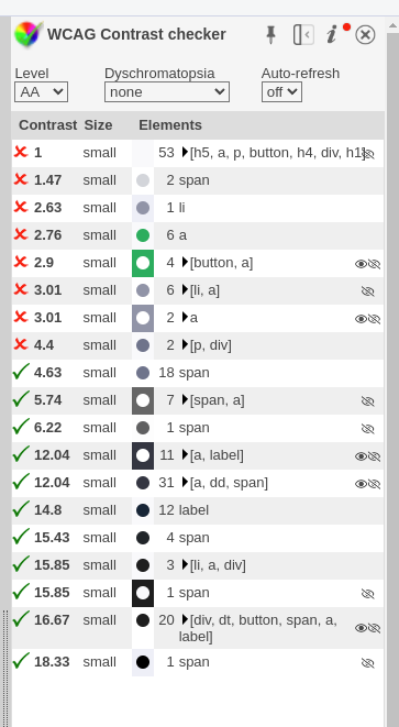 | Steps To Reproduce | Steps to reproduceUse a contrast color checker https://chrome.google.com/webstore/detail/wcag-color-contrast-check/plnahcmalebffmaghcpcmpaciebdhgdf or https://addons.mozilla.org/fr/firefox/addon/wcag-contrast-checker/ for example Expected resultMust be green for AA Level (WCAG ask AAA but …) Actual resultA lot of important par are not at this level, the menu for example are at 3.81 with small size | ||||