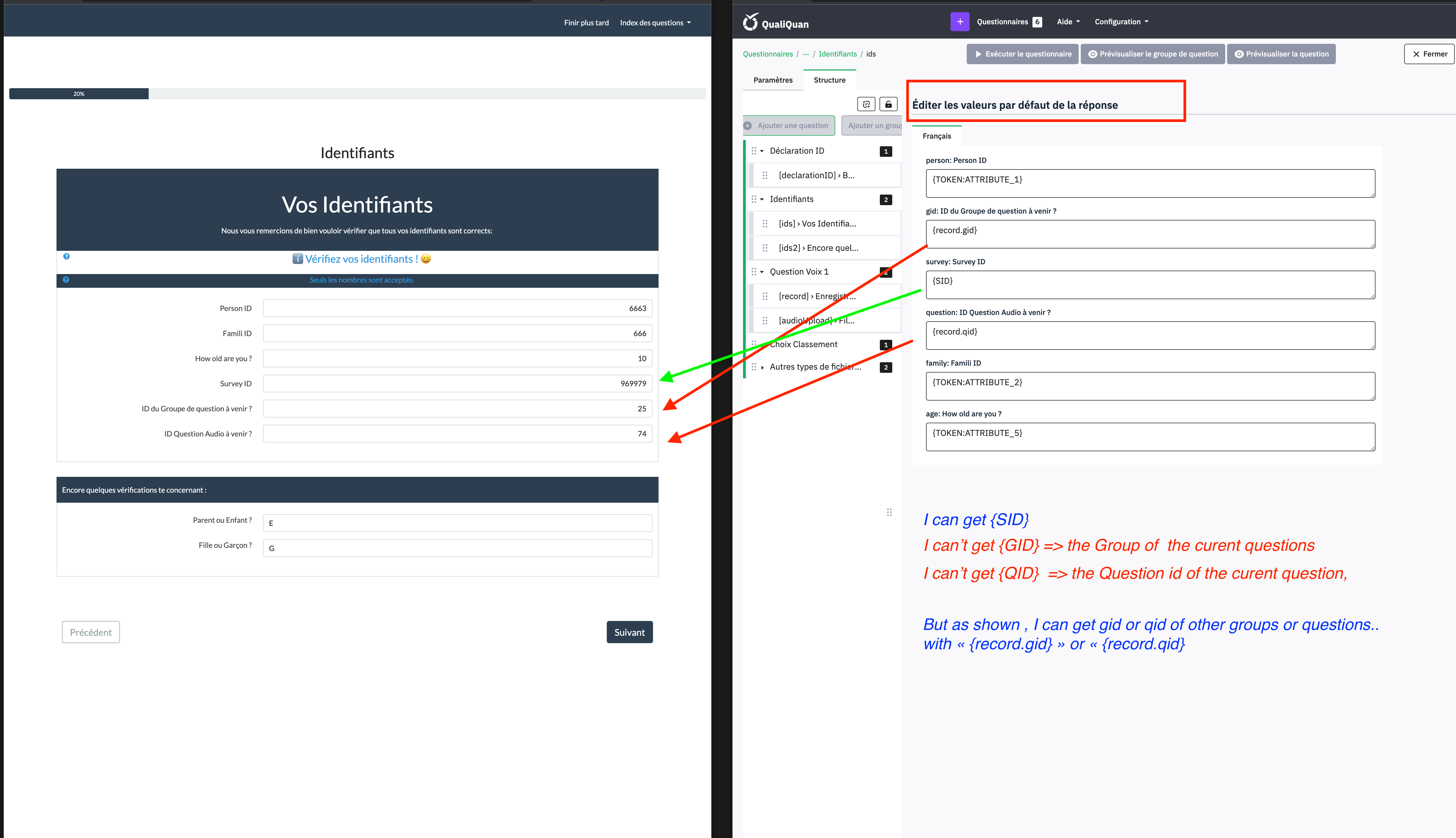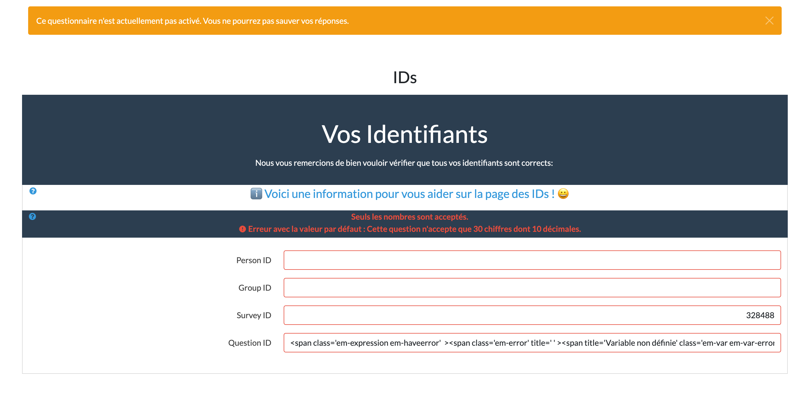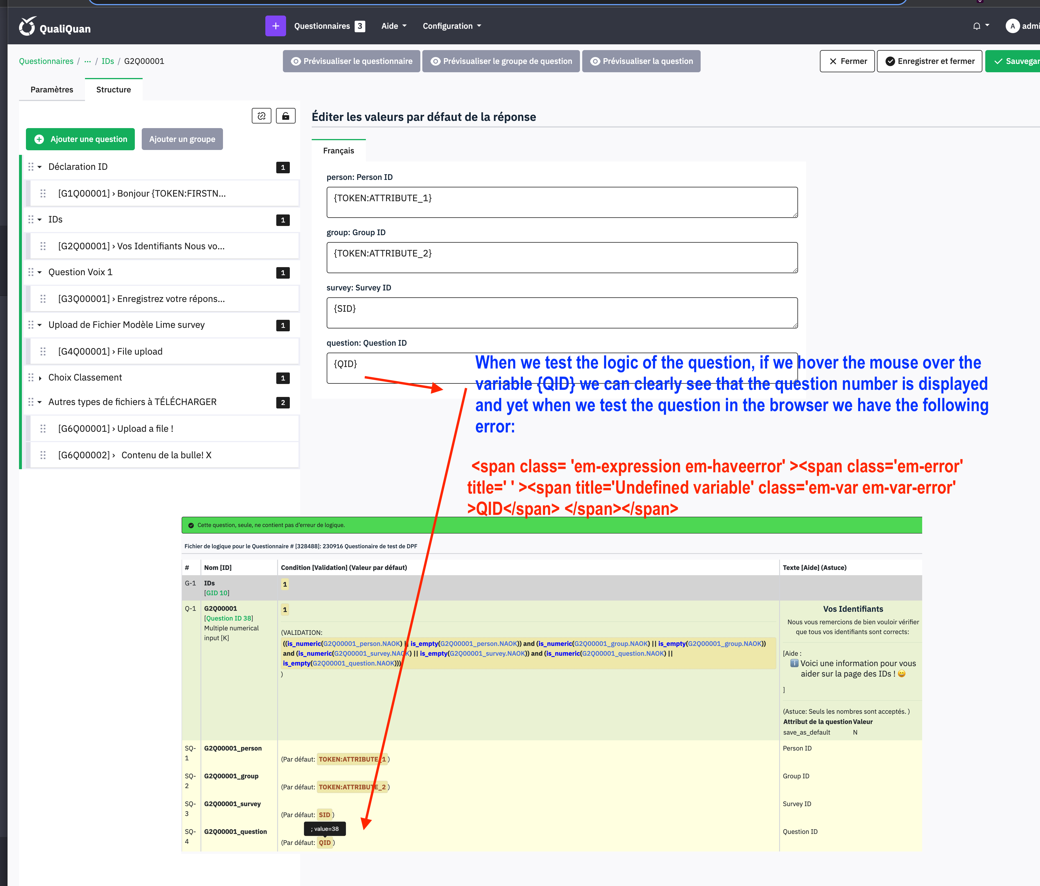| Description | I have defined answer default values in a question but when I assign the variable regarding the question number I get an error. When we test the logic of the question, if we hover the mouse over the variable {QID} we can clearly see that the question number is displayed and yet when we test the question in the browser we have the following error: In a previous question, I've set in the html window the {QID} and i obtain the relevant information (see attached file "Question and survey ID"). So why doesn't it work when we put the {QID} variable in a default response field (see also attached file "error in browser")? Limesurvey details : | ||||
