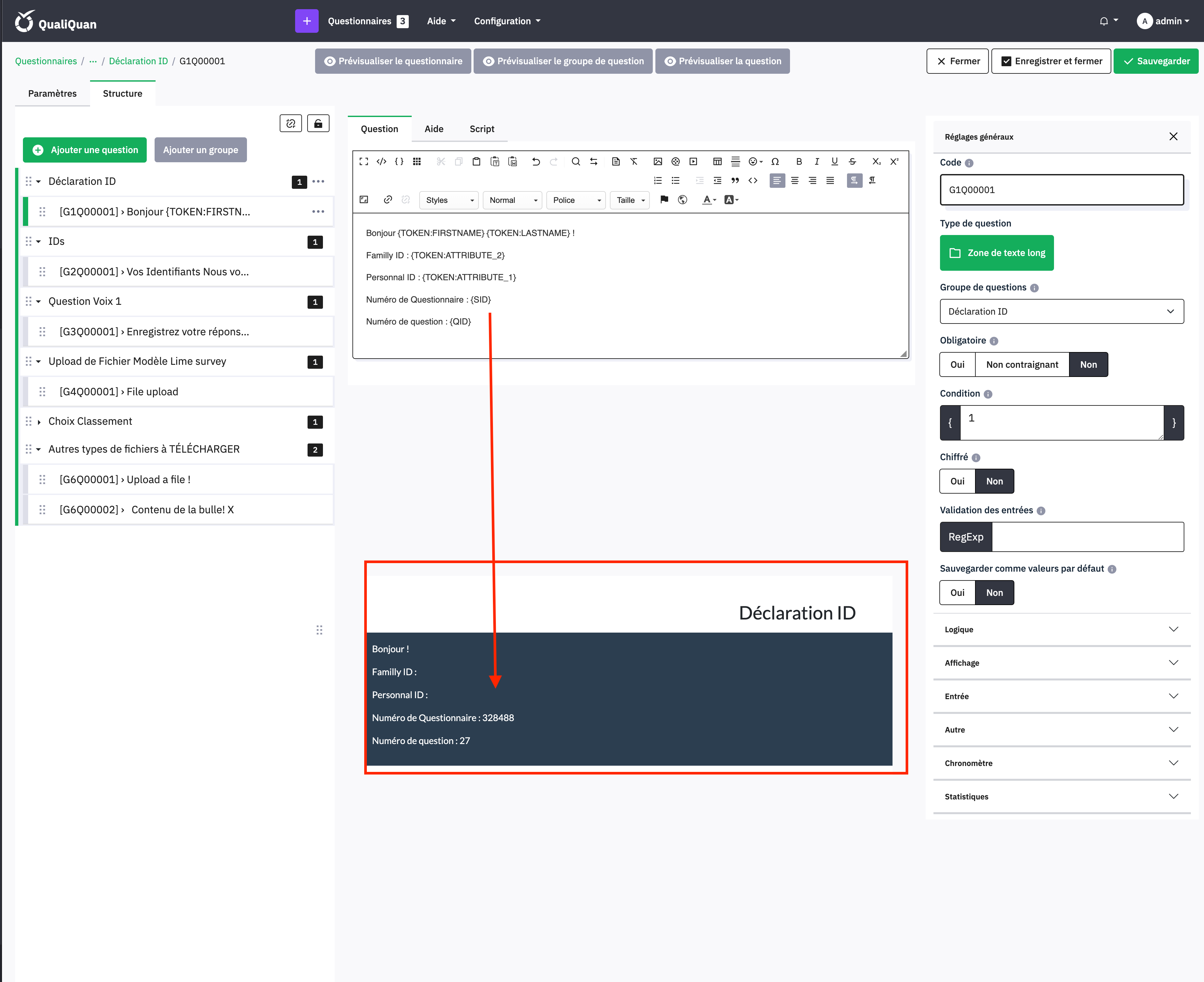 Thanks for your answer, but how ro retrieve current question id ? I need to add this variable in this field and also in a Java script associated with a question ? |