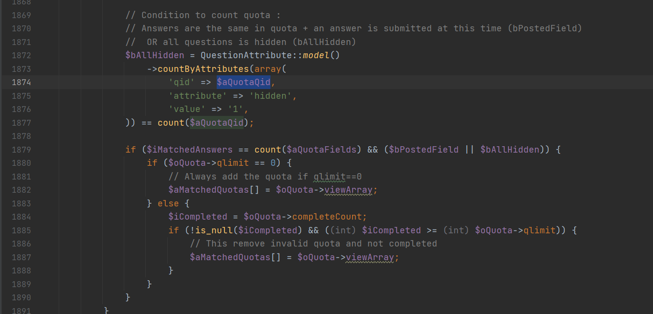 L1879 basically says if the response satisfies all the conditions for the quota and either one of the quota fields was posted or all the quota fields are questions with the "always hide this question" setting enabled. It's this posted part that means it only considers quota which had a value that was sent via post. (ie. the question for the quota was in the group that was just displayed when they clicked next) |
