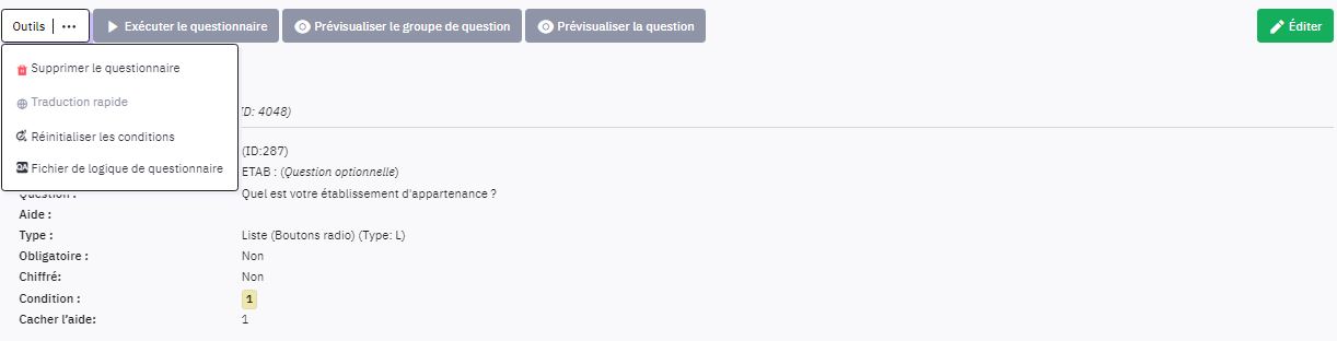 | Steps To Reproduce | (Lors de l'édition des questions il y a les boutons dans le menu Outils : Il n'y a plus accès au Concepteur de conditions ) | ||||