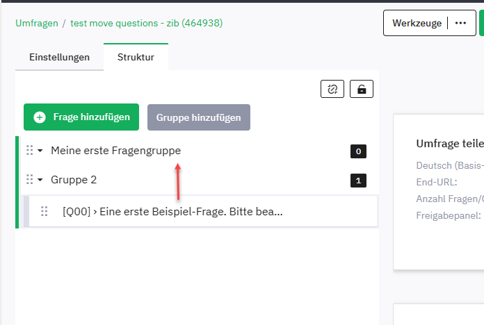 | Steps To Reproduce | Steps to reproduceMove a question from one group to another group via drag & drop Expected resultThis action should persisted so question is listed on new group after persist survey or reload page Actual resultAfter reload the page oder save the survey, the question fall back to old position. | ||||