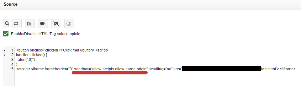 | Description | After recent limesurvey updates, I became unable to use <iframe>s in the survey questions. The iframes are displayed but interaction is disabled. I realised this is because whenever I include an iframe, limesurvey automatically adds the sandbox attribute: sandbox="allow-scripts allow-same-origin" . And despite the exception in the sandbox (allow-scrips), no scripts are permitted to run in the iframe. The most frustrating aspect is that whenever I try to remove the sandbox attribute in the Source editor, this is automatically added back to the code. I eventually managed to get around this issue by disabling the question editor in my account preferences and using the sourcecode editor instead. By using the sourcecode editor, I am finally able to remove the sandbox attribute that kept being added to my iframes, thanks to the very helpful limesurvey community: https://forums.limesurvey.org/forum/installation-a-update-issues/142813-remove-sandbox-attribute-from-iframes . I attach two images to illustrate: Further to this, after the addition of the sandbox attribute, scripts in the iframe won't work. In the test code, there is a button triggering an alert. The iframe contains that same code of the button triggering the alert. What I see when I run the code with the 'sandbox' addition is the two buttons, but the alert is only triggered by the button directly added to the html code, but not the iframe one. | ||||