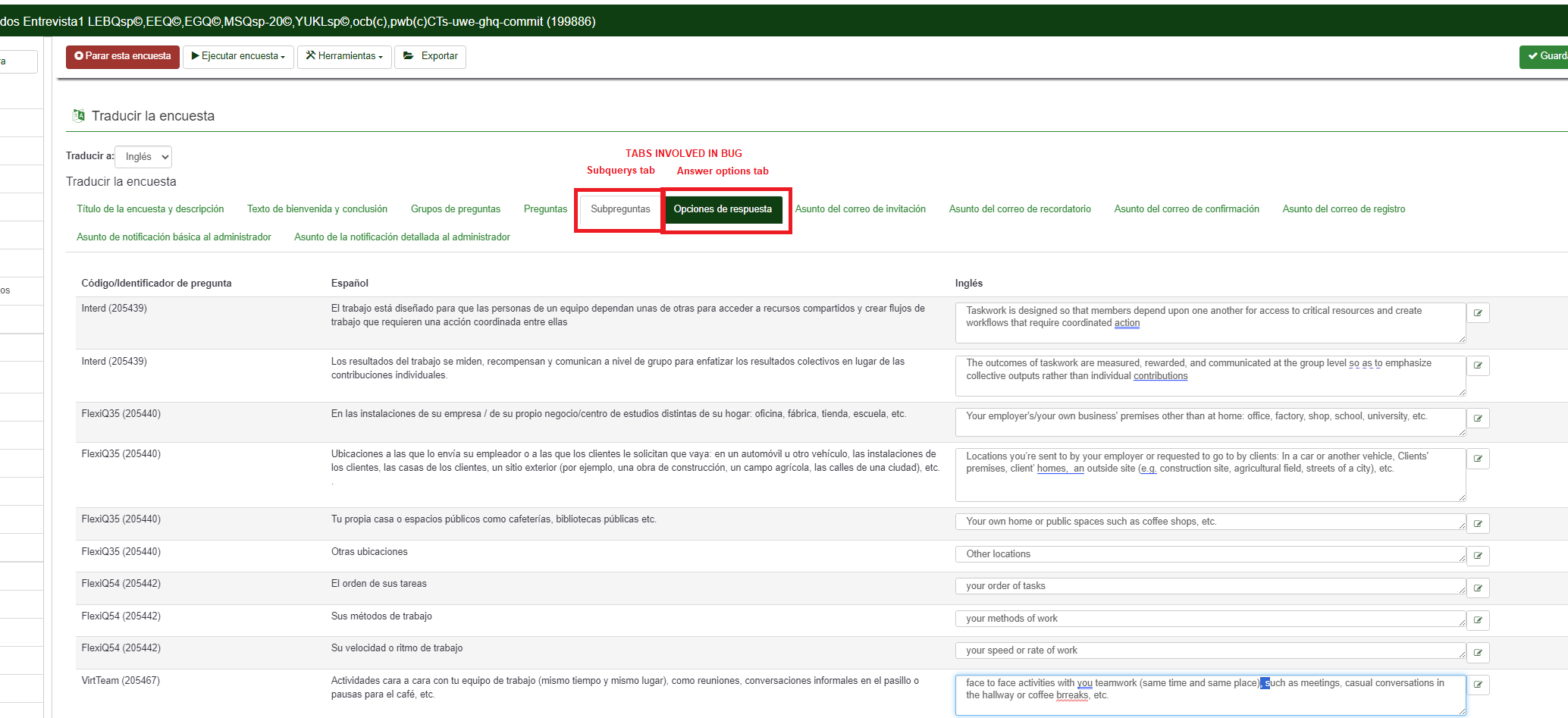 | Description | First of all, I'm not sure if this issue is well classified. It's not strictly on translation project (multilanguages labels an so...) but it's concerning on multilanguage configuration and update changes on database. Symptoms: The quick translation utility does not correctly update database changes for the "subquerys" and "answer otions" fields. It works okey for the rest of the fields. Workarround: You can update this content manually, that's it, edit+save changes | ||||