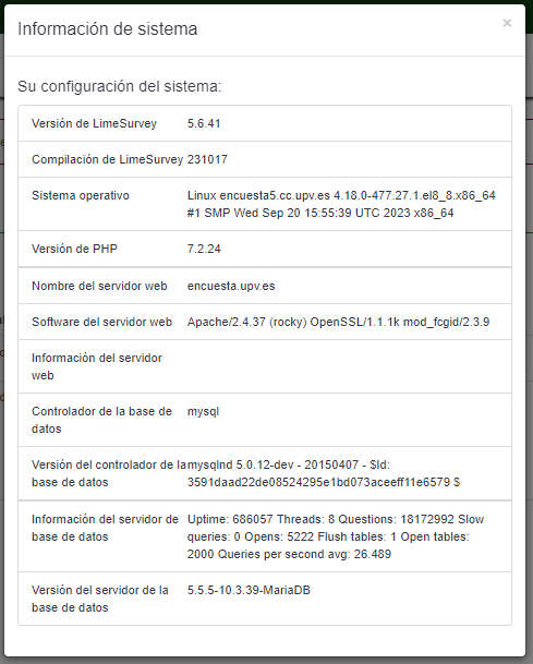 | Complete LimeSurvey version number (& build) | LimeSurvey Community Edition Versión 5.6.41+231017 | ||||