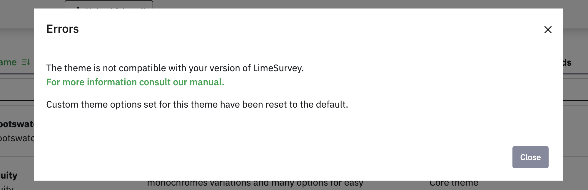 Not only does "Edit Themes" fail, but themes are NOT being applied to surveys. I have 47 active surveys. All are now defaulting to whatever fallback theme applies. I have no ability to edit or control the layout. |