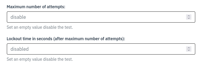 0 or "" can just disable ? Maybe adding a placeholder ? With min=1 <input placeholder="disable" class="form-control" min="1" type="number" name="maxLoginAttemptParticipants" value="3"> Something like this |