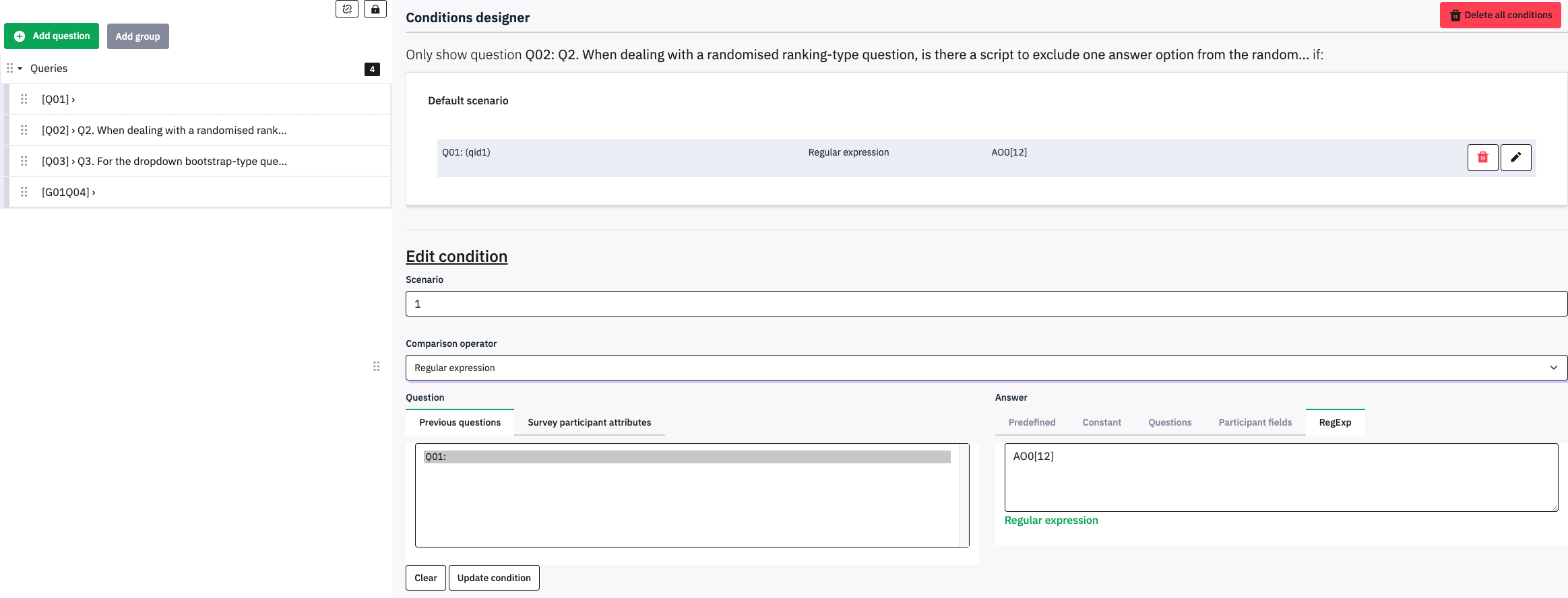 | Summary | 19251: Can't add Regex condition in survey | ||||