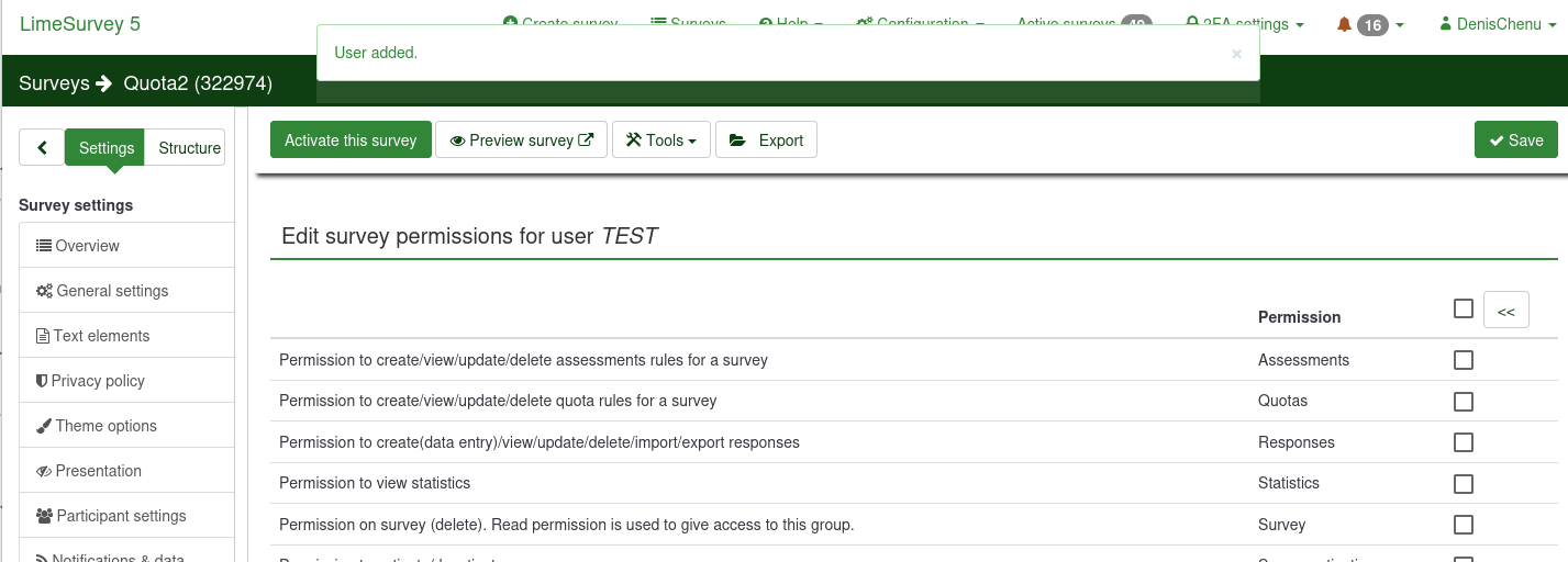 | Steps To Reproduce | Steps to reproduceAdd an user to Survey permission to give all permission in 5.X and 6.X Expected resultbetter UX in 6 Actual resultlower UX in 6