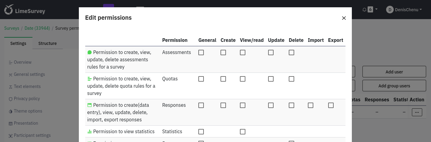 @tibor.pacalat: I was just about to report the same issue for a customer who has updated recently and is using Limesurvey a lot. Not only is the work-flow worse (you need to manually assign permissions at a second step) but also the check-all checkbox for assigning all permissions is missing at 6.x so you need several clicks to assign all permissions, see screenshot. |