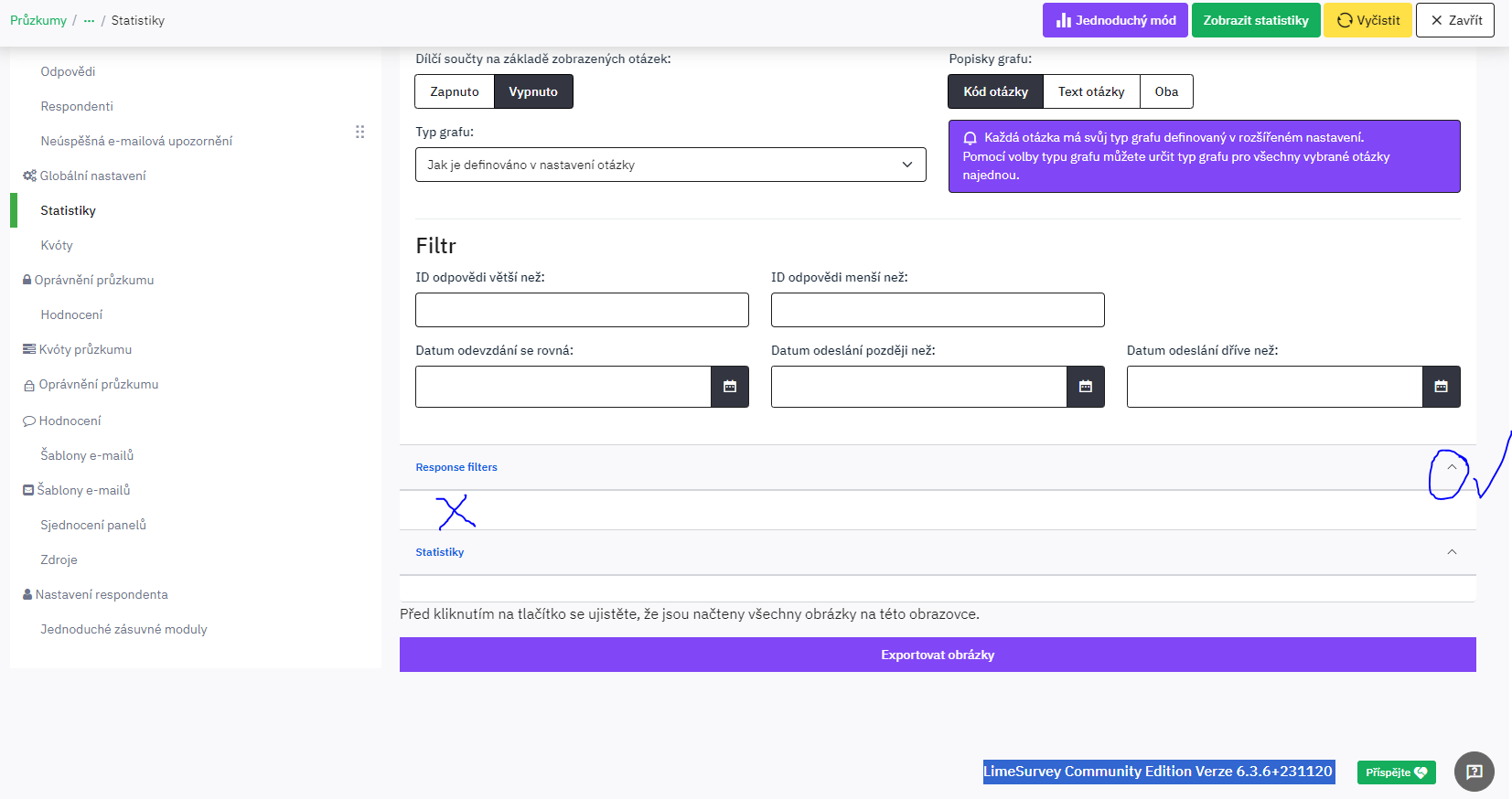 | Complete LimeSurvey version number (& build) | LimeSurvey Community Edition Verze 6.3.6+231120 | ||||