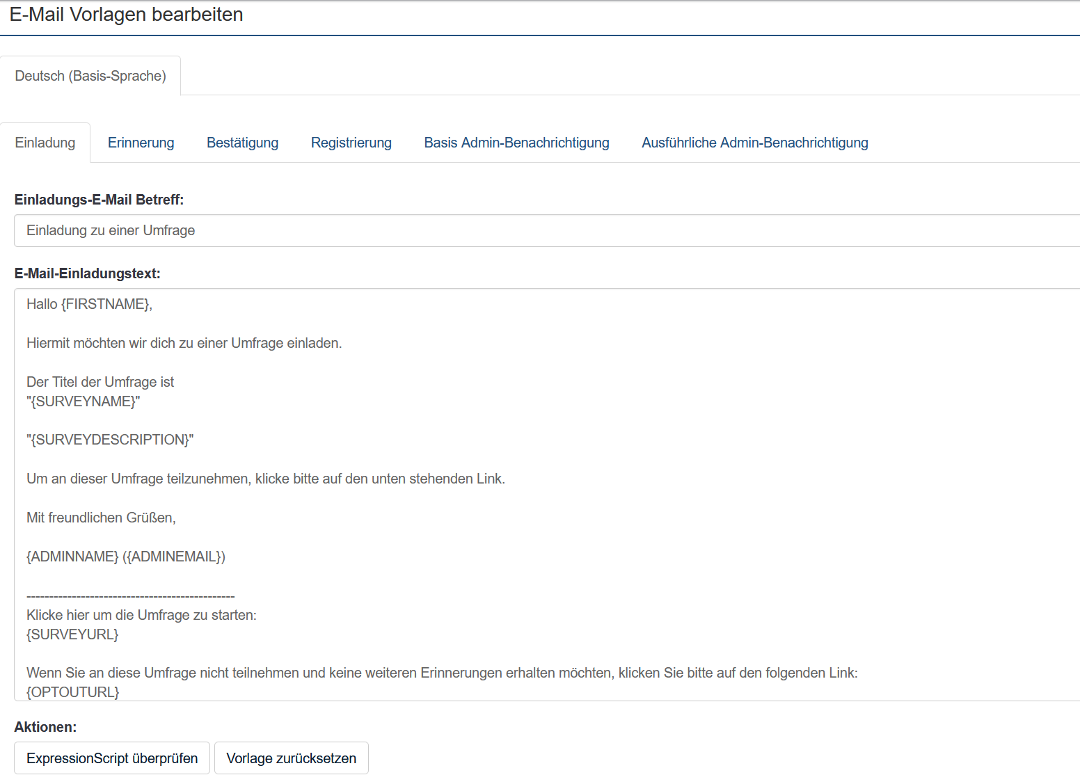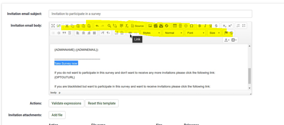 | Description | When I try to edit the E-Mail Templates for invitation or reminders, there is no possibilty to format the mail. I found out, that some of my "old" surveys have the buttons when I edit the invitation email template. those templates were created with limie survey v3... | ||||