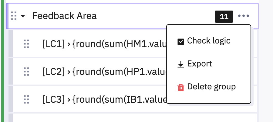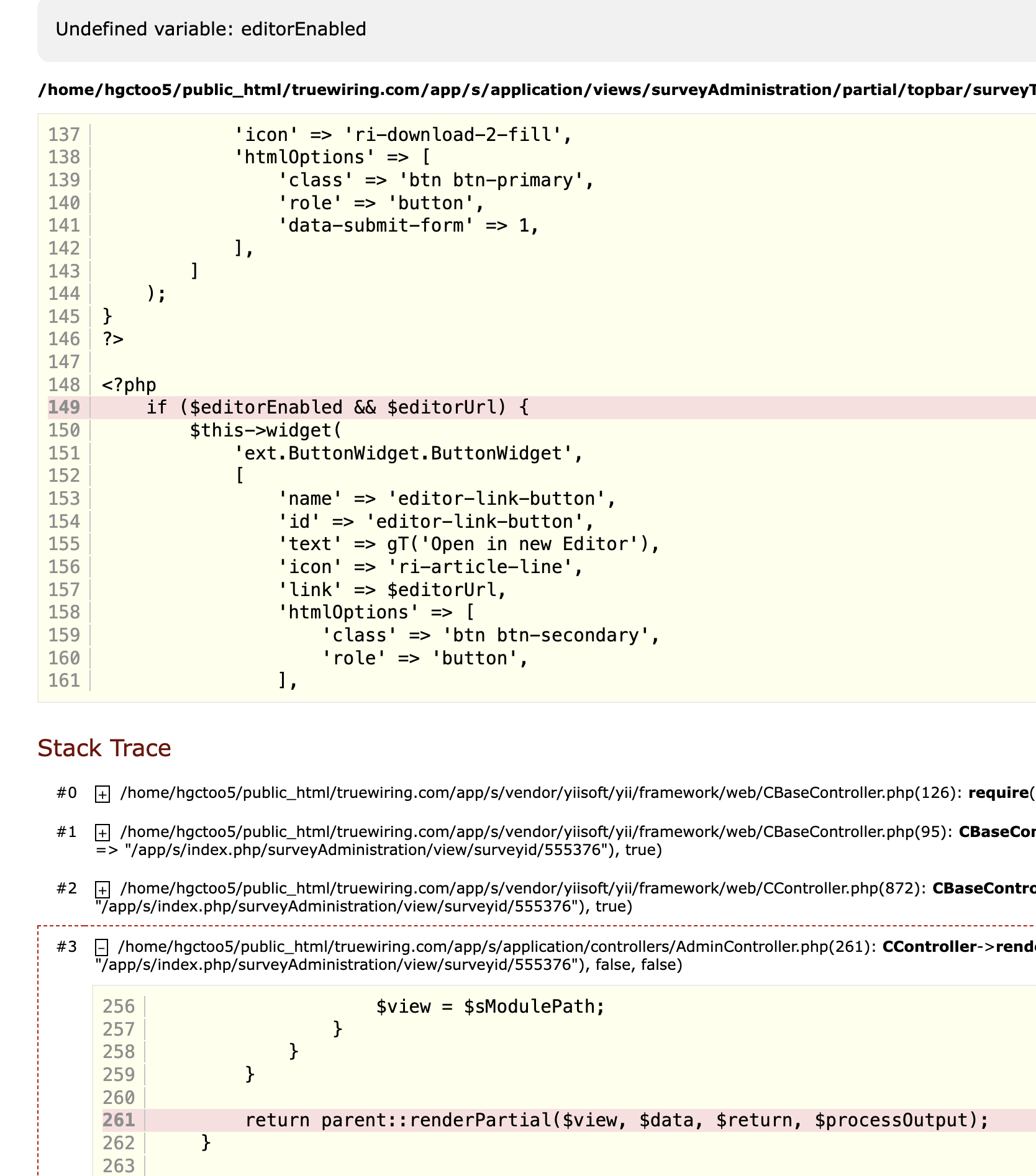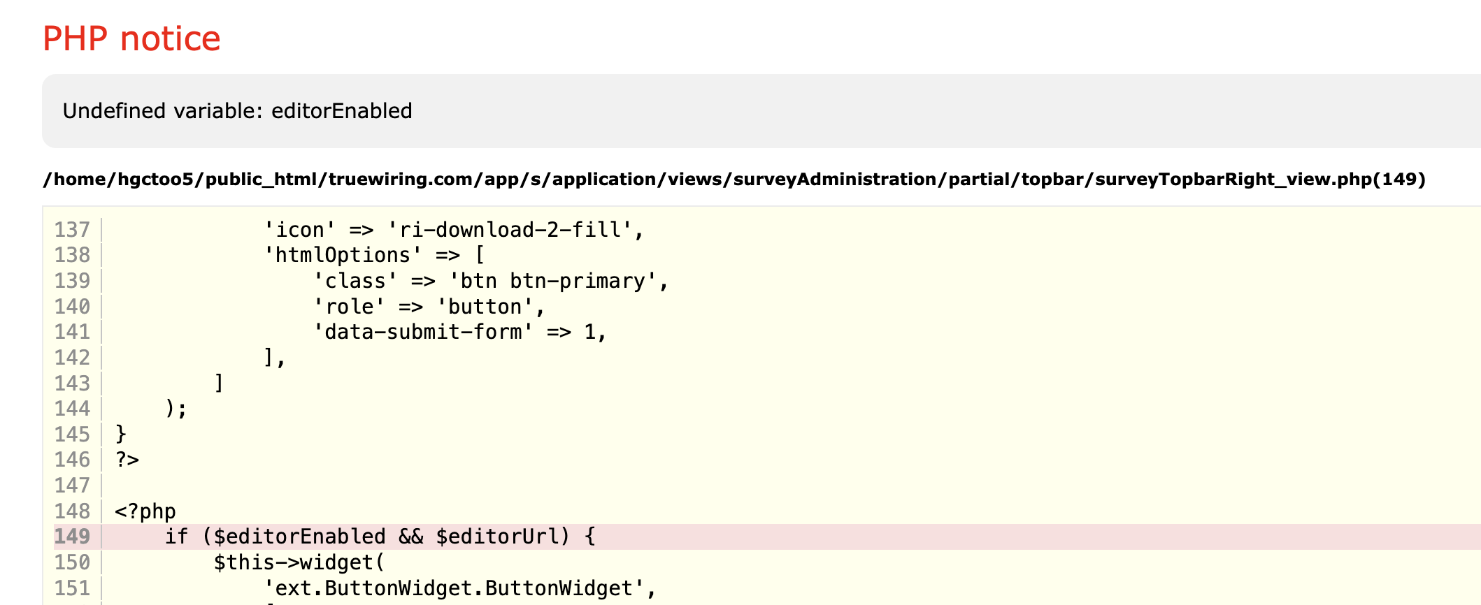 | Steps To Reproduce | Steps to reproduceSelect any survey /.../application/views/surveyAdministration/partial/topbar/surveyTopbarRight_view.php(149) Expected resultI expected to see the Survey Logic file to verify my equations (in this particular case) Actual resultPHP Notice /home/hgctoo5/public_html/truewiring.com/app/s/application/views/surveyAdministration/partial/topbar/surveyTopbarRight_view.php(149) 137 'icon' => 'ri-download-2-fill', | ||||