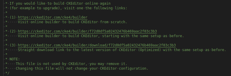 Updated to the latest “open source” version of CKEditor 4 (4.22.1). There is an LTS but the license changed. If not, we would have to go to 5, but I don't know what that entails (neither technically nor from the licensing side). Onthe other side... CKEditor has an online “builder” to put together the package with the configuration you want. When you download the package, the zip includes the build-config.js file with the configuration that was used to build the package. Includes three links: Previously (ticket 18881), we had done the update with the third link, and now we did it with the second, because if not mistaken, the third link downloaded the “LTS” version, which had a license change. We overwritten everything except config.js, which has Lime stuff. |