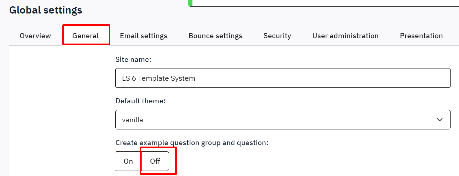 | Description | Global settings -> General: if you tunr OFF "Create example question group and question:" this is NOT marked at the settings. Only status ON gets marked with a black background. | ||||
