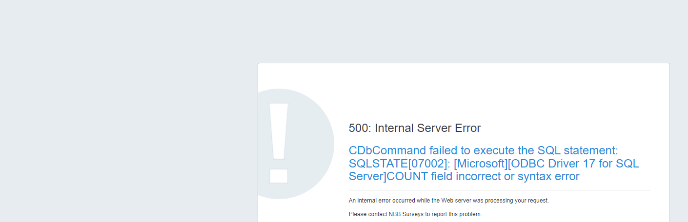| Steps To Reproduce | Steps to reproduceTo reproduce this incident, after logging in as admin, I go to the list of surveys then I filter on any group and finally I launch the search (attached screenshot) Expected resultThe expected result would be to show me the surveys according to groups Actual resultWhich gives me error 500 with the following message CDbCommand failed to execute the SQL statement: SQLSTATE[07002]: [Microsoft][ODBC Driver 17 for SQL Server]COUNT field incorrect or syntax error | ||||