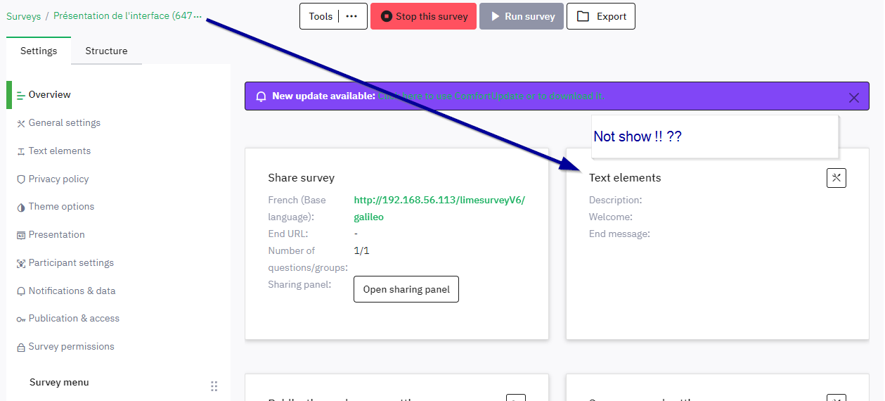 | Description | you have to go to the head elements to see the title of the questionnaire whereas you should see it in the global view | ||||