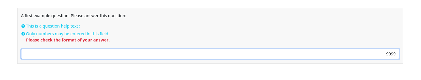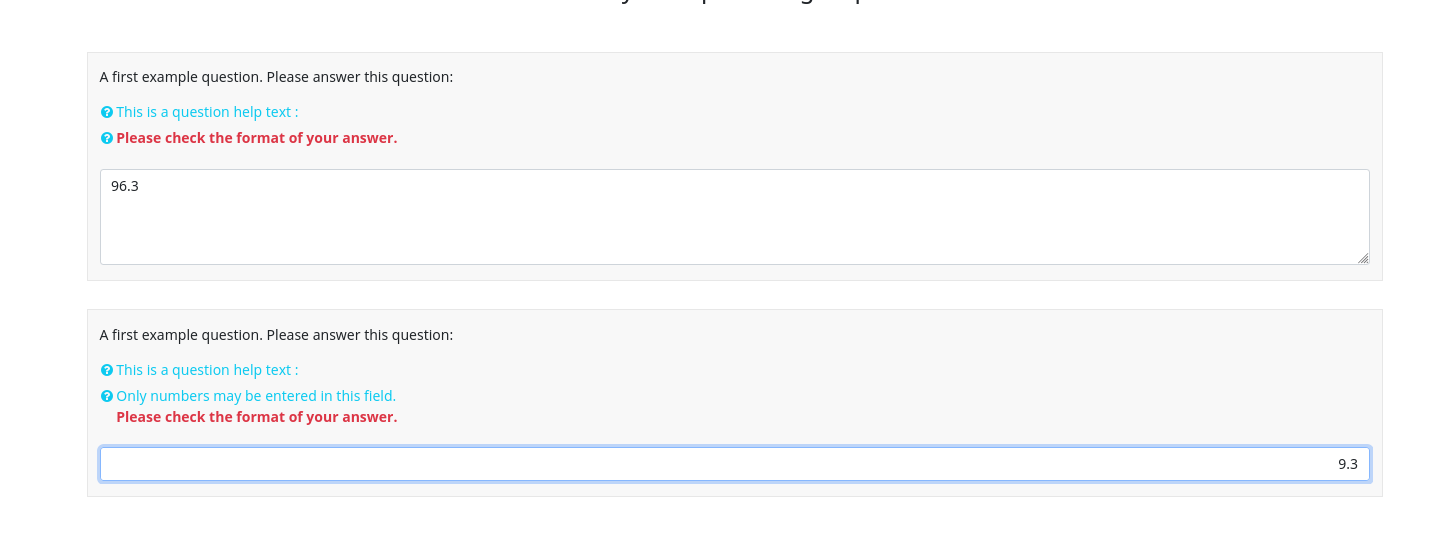 | 2024-02-22 12:40 | DenisChenu | Summary | Input validation does not work correctly with input numeric => Input validation does not work correctly with input numeric when reload response |