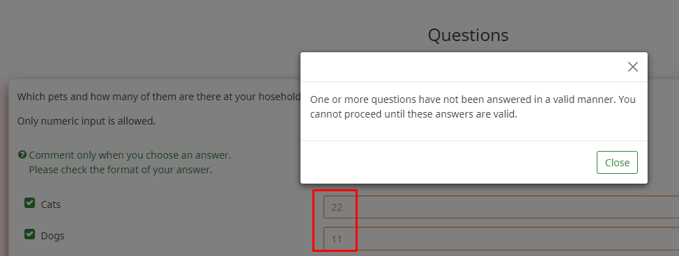 | Description | At multi choice with comments questions one can add a regex. It is assumed that this regex is applied to the text input fields. But If a regex checking e.g. for numeric input ("/^\d+$/") is entered there, the validation fails. You can enter numeric values but there is still an error shown. | ||||