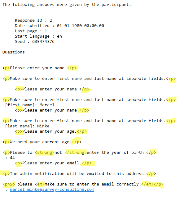 | Steps To Reproduce | Steps to reproduceImport and activate the attached survey and run it. Enter your email at the last question. The detailed admin notification with questions and answers gets sent to that address later, Expected resultSee question text only, no HTML. Maybe replace line breaks by raw text line breaks. Actual resultThere is lots of HTML within the questions, see attached screenshot. | ||||