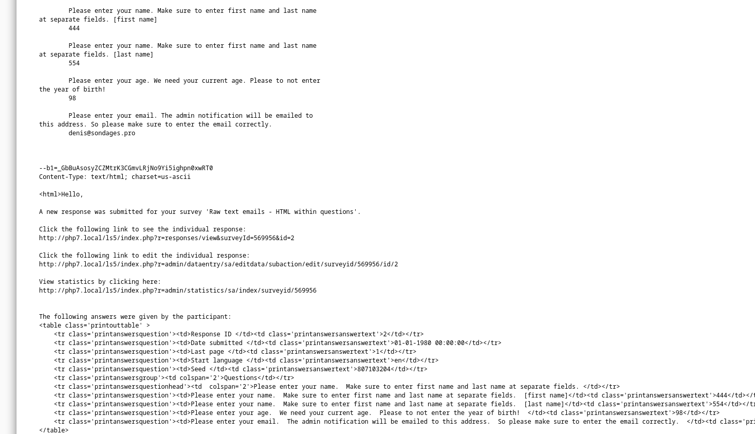 | 2024-03-05 18:00 | DenisChenu | Summary | When sending raw text admin notifications, HTML within questions doesn't get filtered => ANSWERTABLE contains html tags with text email in admin notification |