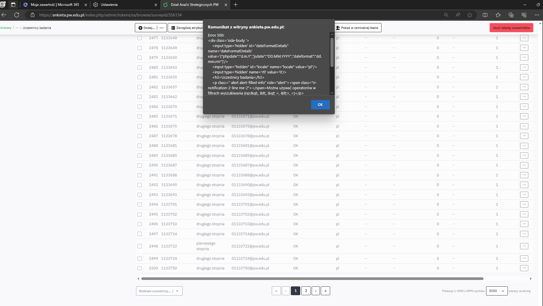 For my largest survey of about 40k participants not only does it take 15+ seconds to load any option (while loading the screen appears grey, see attached file Slowness_appearance), but also in some cases trying to send invites or reminders to the participants shows no response and reloading page throws error (see attached file Error1). Trying to expand number of participants per page at the bottom right of the site works only for about maximum of 250 participants per page (Chrome) or 2500 participants per page (Microsoft Edge) if I try to show more it throws an error as well (see attached file Error2).