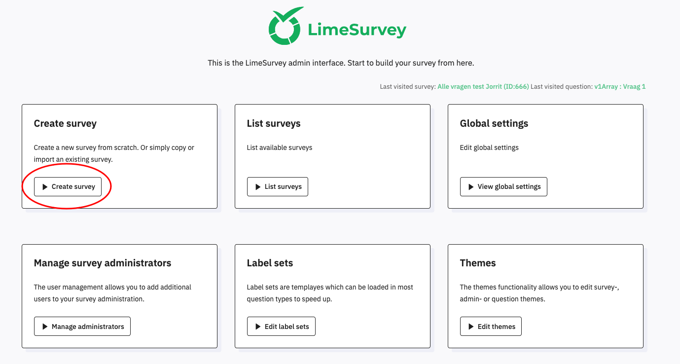 | Description | When you click the + icon in the top bar to create a survey, you correctly go to the create-survey page ([hostname]/index.php/surveyAdministration/newSurvey) However, when you're on the start page and click the create surveys button on the survey tile, you go to a non-existing page leading to a 404 error ([hostname]/index.php/admin/survey/sa/newsurvey) | ||||
