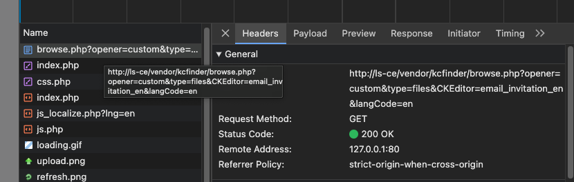 If you look at the screenshot, the console is below and shows an error on this page and failed requests are above marked with red icon with a black cross inside. I assume that something with the KCFinder is not loading properly. For example this request that is successfully finished in my local instance (2nd screenshot http://ls-ce/vendor/kcfinder/browse.php?opener=custom&type=files&CKEditor=email_invitation_en&langCode=en) |