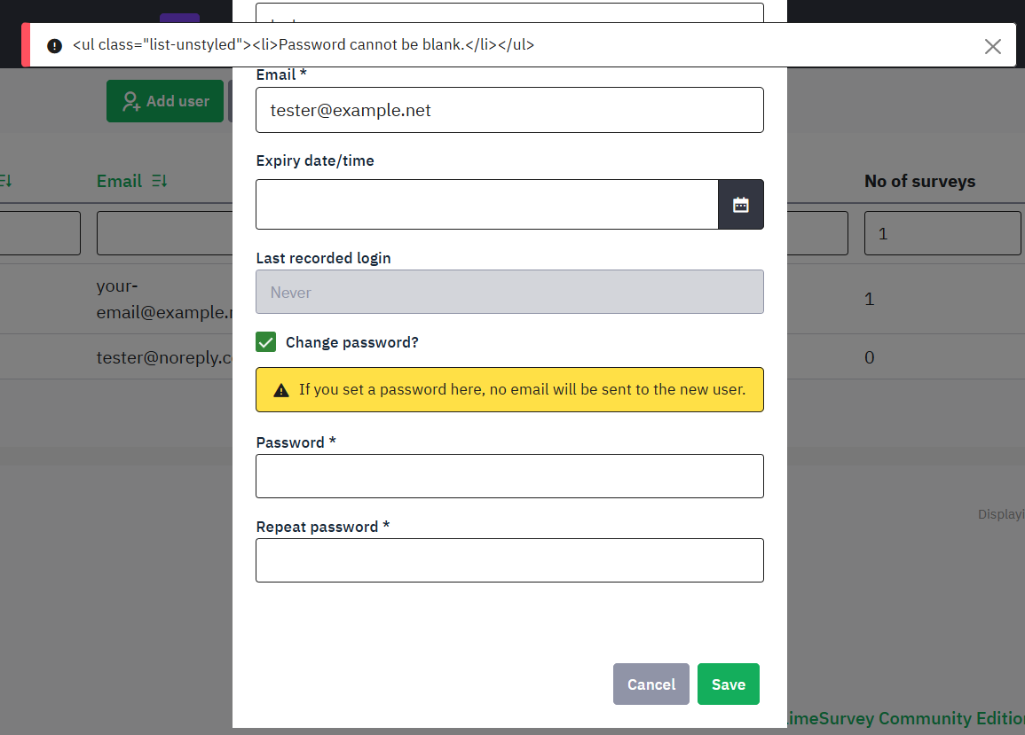| Steps To Reproduce | Steps to reproducecreate a new user, set an empty password and press save Expected resultmessage about password policy is shown in formatted text and it stays Actual resultmessage about password policy is shown in unformatted text with html tags inside it. Moreover, it disappears quite quickly | ||||