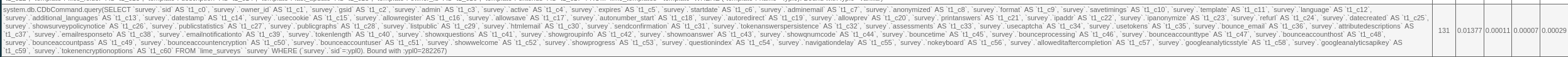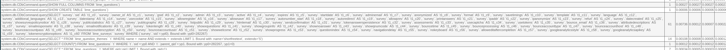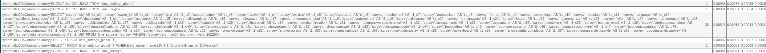 If you have a chance, it would be interesting to know what would be the query result with my suggested PR to reduce reasonably the calling of survey finds https://github.com/LimeSurvey/LimeSurvey/pull/3819/files I tend to be a bit skeptical about overriding the framework logic. If you have a general knowledge about how the framework works and there is one model where you have overridden it, it might cause problems later in other places. For me it seems more logical to start from fixing bad code and assess the situation after fixing obvious code inefficiency issues. A good example of what I mean is this having a survey find in such a loops can possibly explode these queries. Maybe fixing inefficient code will cut most of the queries so that it will not be that big of an issue any more to fix? |