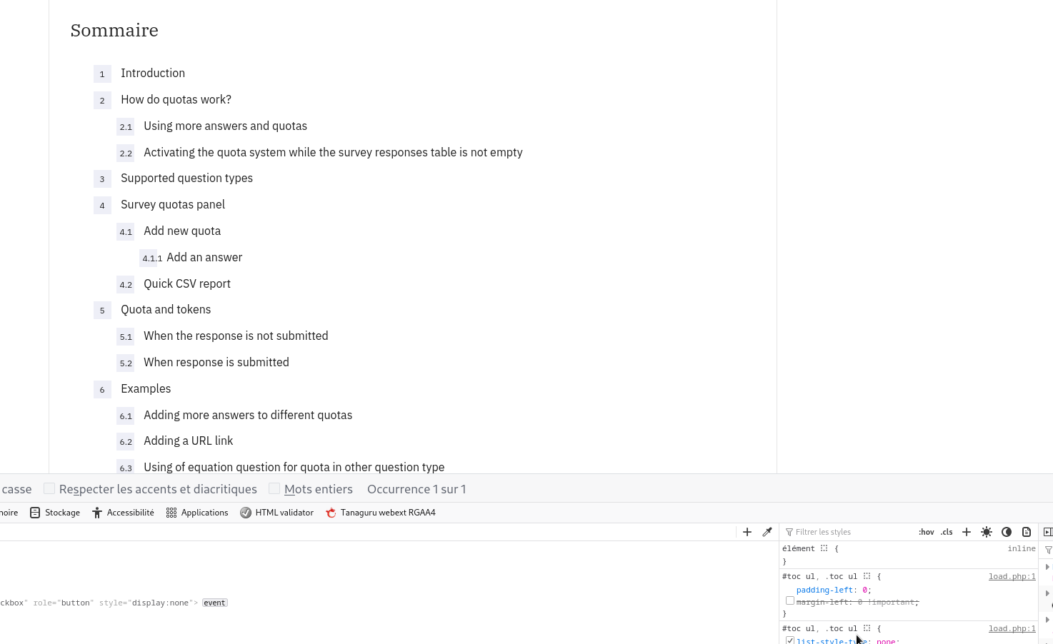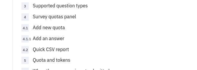 | Steps To Reproduce | Steps to reproduceGo to https://manual.limesurvey.org/Survey_quotas/en Expected resulthave some left margin on toc lvele , show eachlevel better