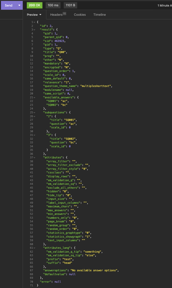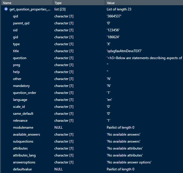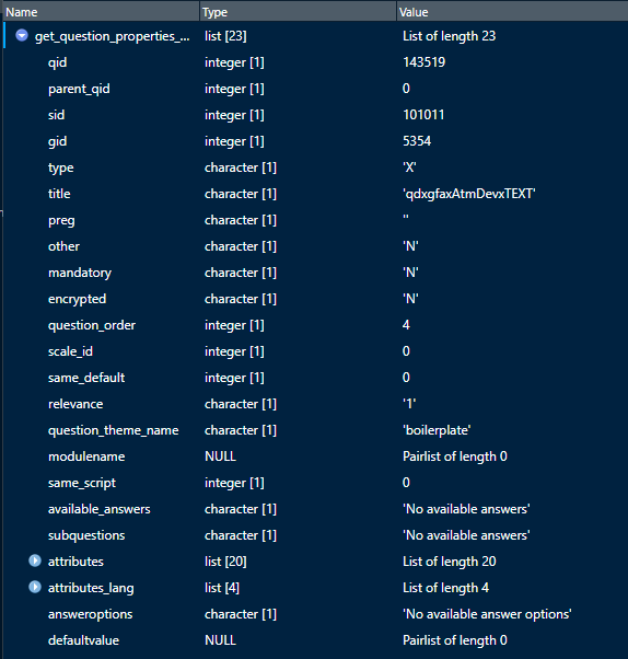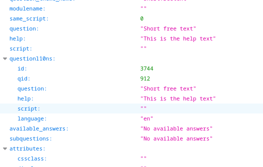 | Description | Hello, To help visualize what I mean, I'm including screenshots of the return array for "get_question_properties" from LS 3.22 and 6.5.4. I am not attaching an LSS since this is not relegated to a specific survey. | ||||