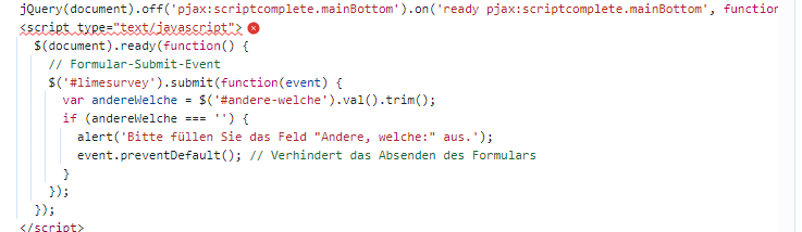 | Description | Hey, we have a project that uses simple expressions like the question before must be answered with 1 or 2. However, even choosing the Vanilla LS Theme, the filtering does not work. I opened up the browser console and saw that there is a syntax error: Error: Uncaught SyntaxError: Unexpected token '<' (at 985146:1979:1) The code with the error seems to be: jQuery(document).off('pjax:scriptcomplete.mainBottom').on('ready pjax:scriptcomplete.mainBottom', function() { | ||||