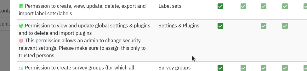 | Description | We should add a warning to permissions interface when assigning "Settings & Plugins" to an admin, to make it clear it should only be assigned to trusted persons. Something like: | ||||