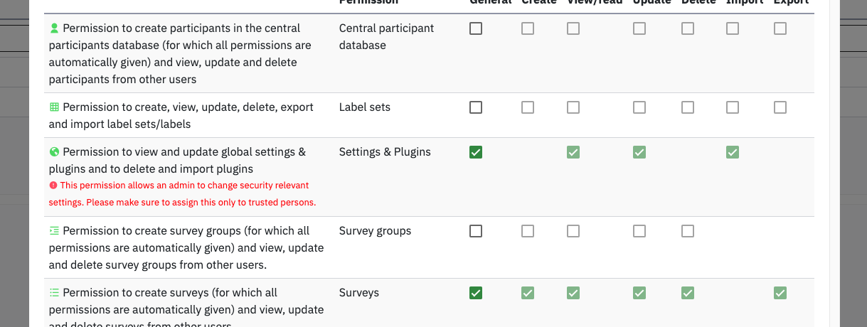 Hi Denis, sure you can add those warnings as well. I tested your PR https://github.com/LimeSurvey/LimeSurvey/pull/4067, but I don't see any warnings :/ Went to User management and created new user and in that process assigned general Settings & Plugins permission. |
