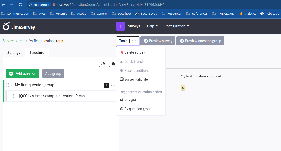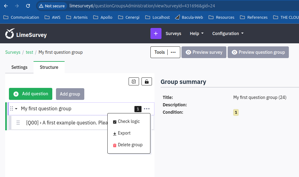| Steps To Reproduce | Steps to reproduceClick on question group in the survey structure sidebar. Expected resultQuestion group actions are shown (group logic, delete group, etc) Actual resultSurvey actions are shown (delete survey, survey logic, regenerate question codes, etc.) (Write here what happened instead) | ||||