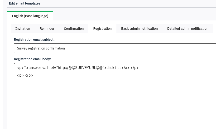 <surveyls_email_register><![CDATA[<p>To answer <a href="http://@@SURVEYURL@@">click this</a>.</p>