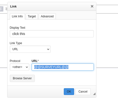 Usage must be <a href="@@SURVEYURL@@"> It works for me on last master version And it's OK on your server too (except you must remove the extra http:// you add yourself) |