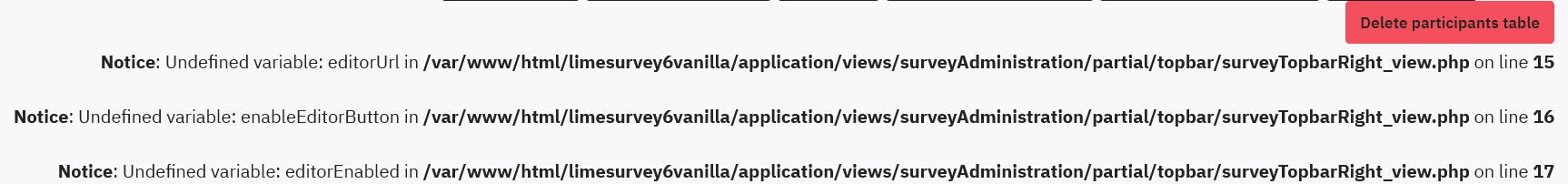 I've activated debug. Notice: Undefined variable: enableEditorButton in /var/www/html/limesurvey6vanilla/application/views/surveyAdministration/partial/topbar/surveyTopbarRight_view.php on line 16 Notice: Undefined variable: editorEnabled in /var/www/html/limesurvey6vanilla/application/views/surveyAdministration/partial/topbar/surveyTopbarRight_view.php on line 17 On the other hand, the F12 console stays blank except for which however I see in other pages as well Then |