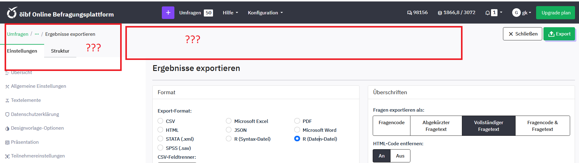 | Description | Hi, It is pretty annoying that while having opened several surveys simultaneously I cannot judge by a quick glance to identify which one I am currently working in. I believe there was some information in the upper left corner in the previous version. I always need to go to text elements to retrieve this vital information. In the header empty space is available (see screenshot). Why not use it? | ||||