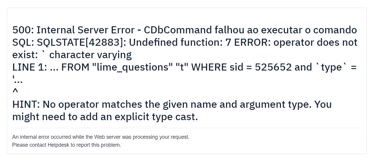 | Steps To Reproduce | Steps to reproduceGo to the survey list and try to generate statistics. Expected resultGet the survey statistics. Actual result500: Internal Server Error - CDbCommand failed to execute the SQL statement: SQLSTATE[42883]: Undefined function: 7 ERROR: operator does not exist: | ||||
