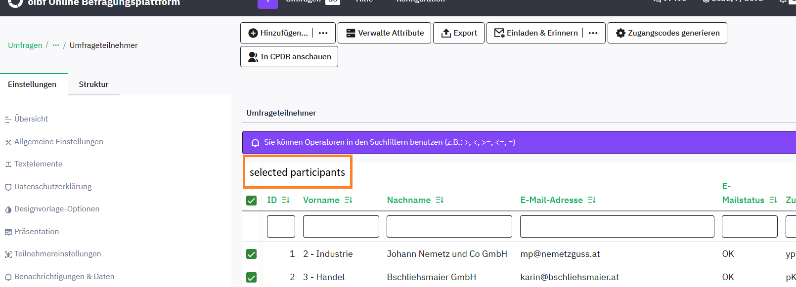 | Description | Hi, I am sending large quantitites of emails via Limesurvey. When I mark all participants I need to scroll to the bottom of the page (which -- depending on the number of participants -- can take a while) to find the context menu to manipulate the selected participants. I would appreciate a menu at the top, too (see screenshot). | ||||
