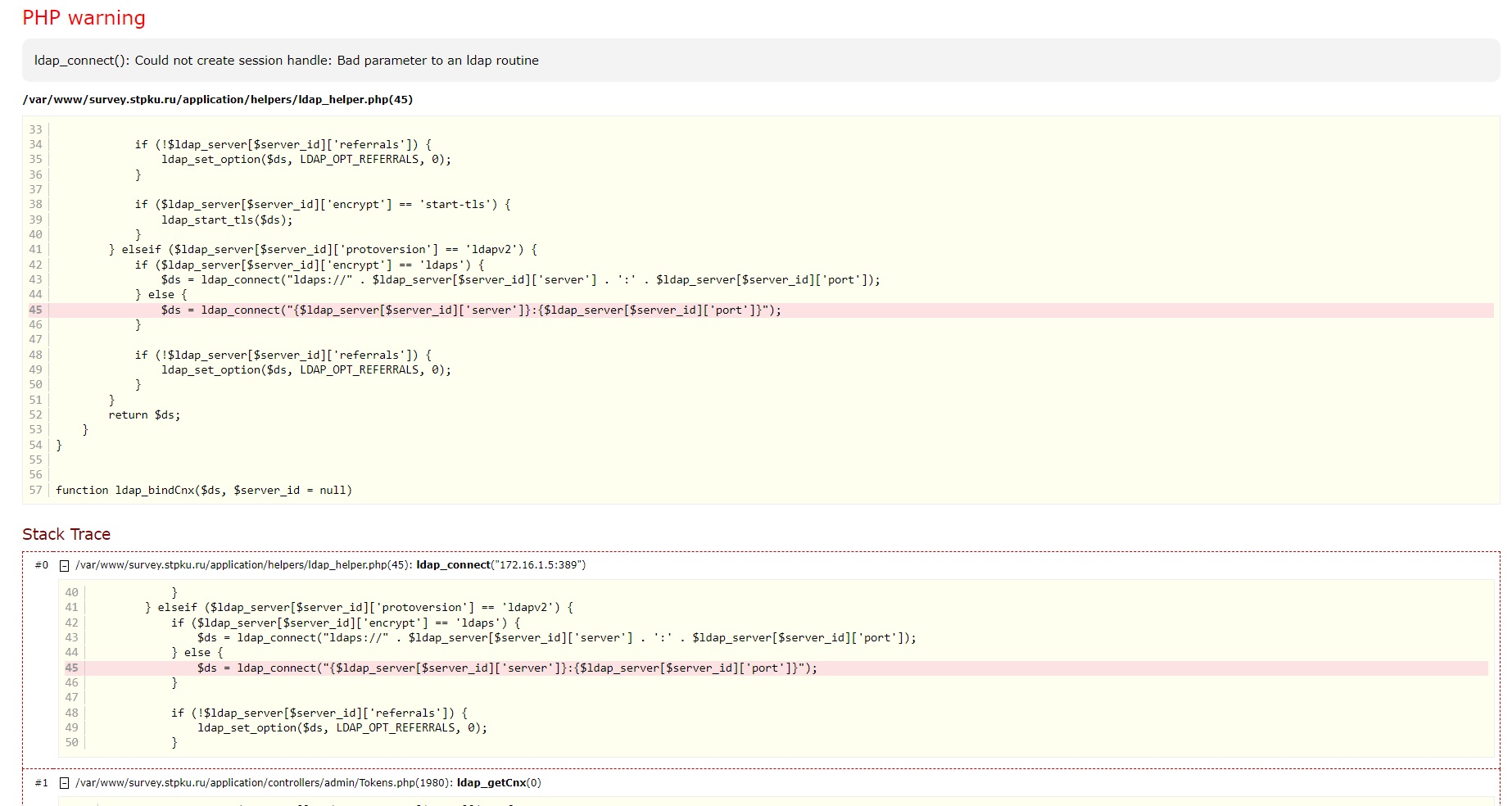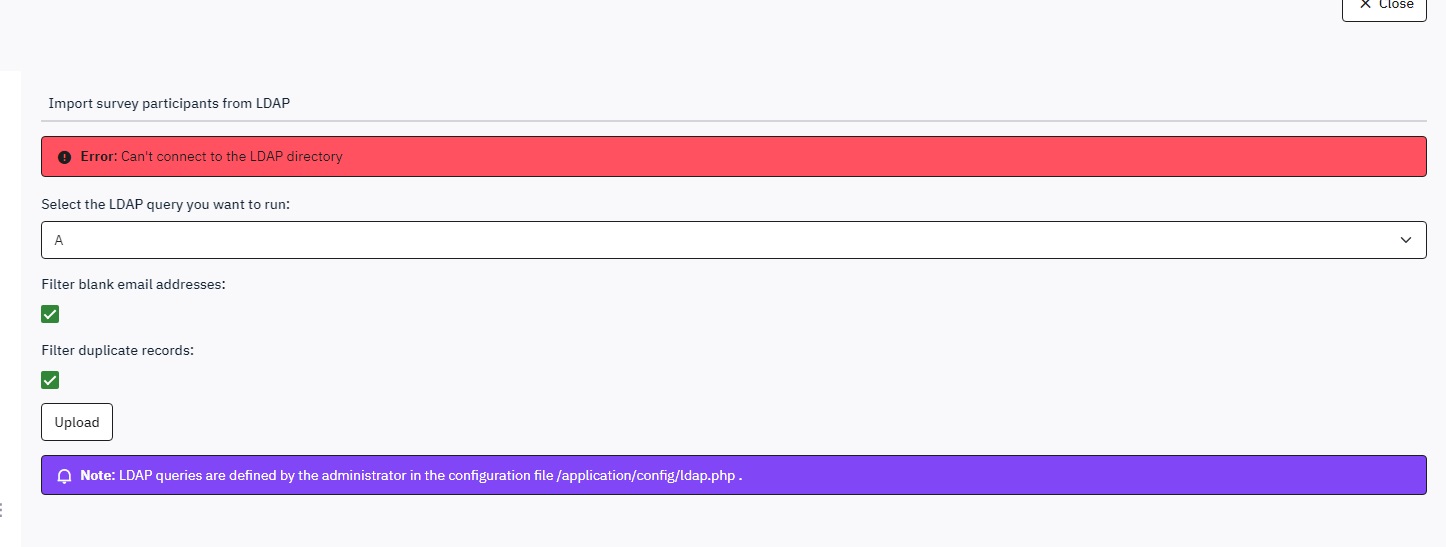 | Steps To Reproduce | Steps to reproduceTry to upload survey participants Expected resultThe participants must be obtained from an LDAP query Actual resultError: Can't connect to the LDAP directory | ||||